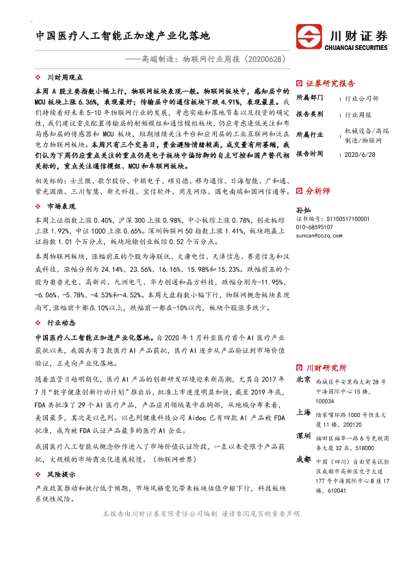 【川财证券】【20200628】20200628-川财证券-高端制造:物联网行业周报:中国医疗人工智能正加速产业化落-19页