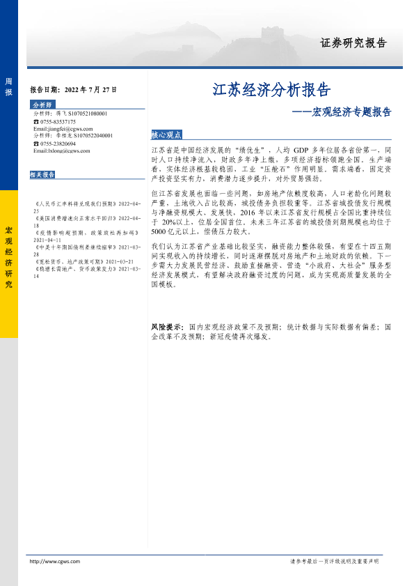 【长城证券】【20220727】宏观经济专题报告:江苏经济分析报告-18页