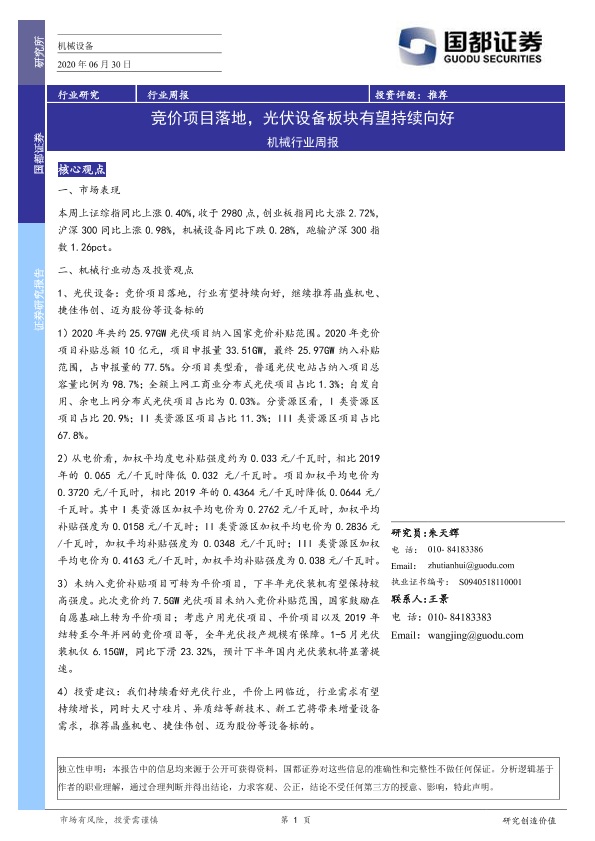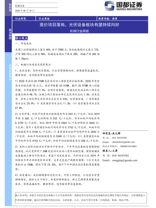 【国都证券】【20200630】20200630-国都证券-机械行业周报:竞价项目落地,光伏设备板块有望持续向好-3页