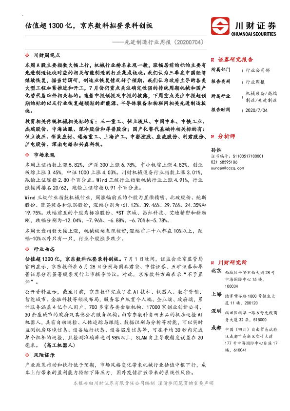 【川财证券】【20200704】20200704-川财证券-先进制造行业周报:估值超1300亿,京东数科拟登录科创板-9页