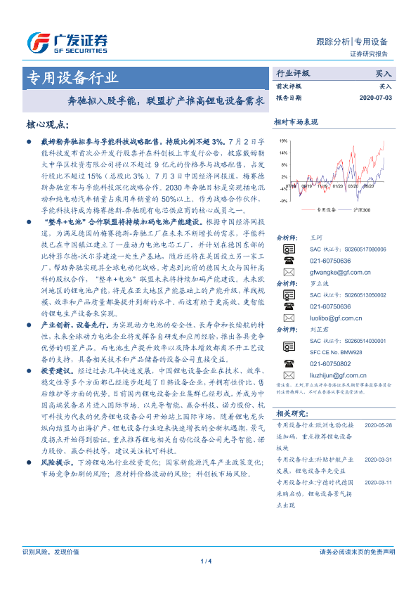 【广发证券】【20200703】专用设备行业跟踪分析:奔驰拟入股孚能,联盟扩产推高锂电设备需求-4页