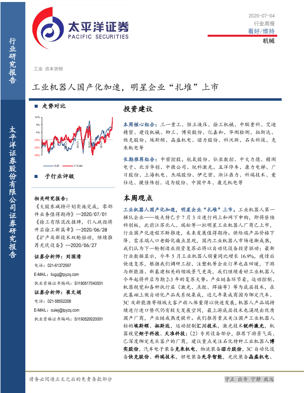 【太平洋证券】【20200704】机械行业周报:工业机器人国产化加速,明星企业“扎堆”上市-13页