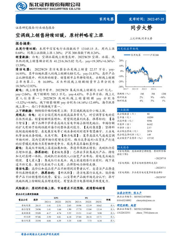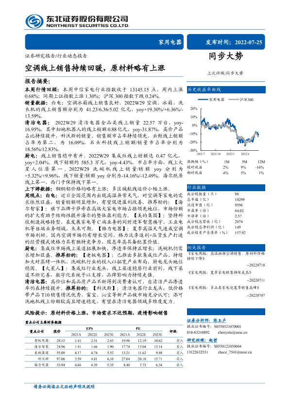 【东北证券】【20220725】家用电器行业:空调线上销售持续回暖,原材料略有上涨-15页