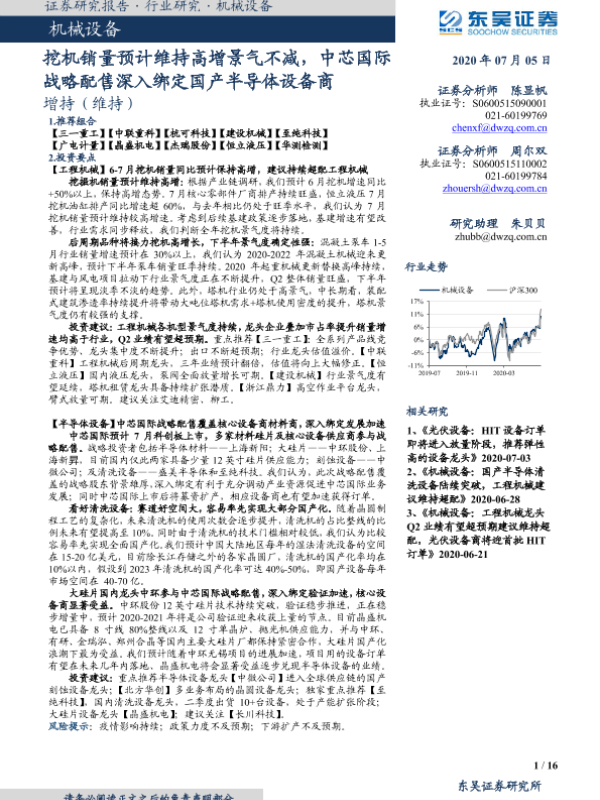 【东吴证券】【20200705】机械设备:挖机销量预计维持高增景气不减,中芯国际战略配售深入绑定国产半导体设备商-16页