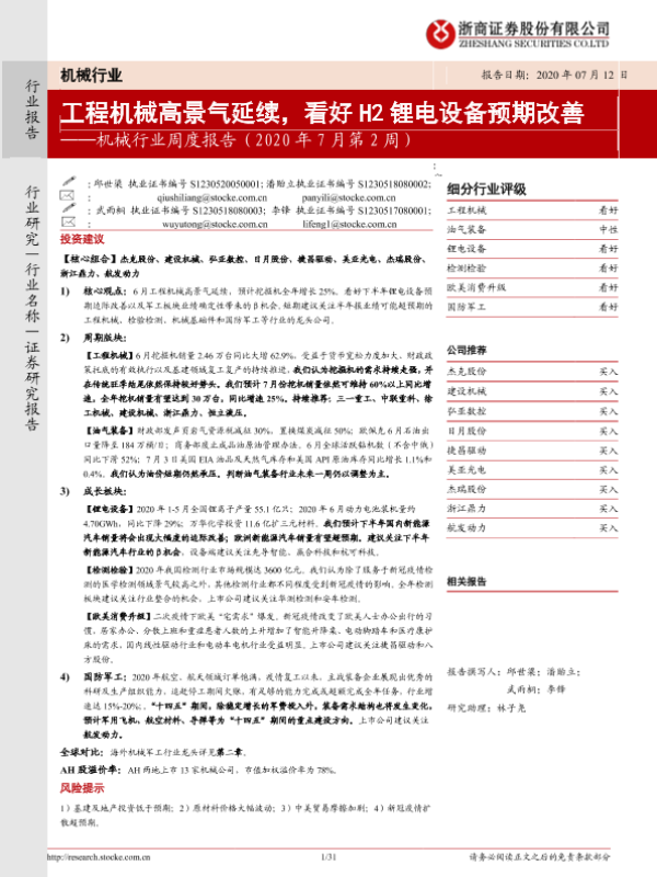 【浙商证券】【20200712】20200712-浙商证券-机械行业周度报告(2020年7月第2周):工程机械高景气延续,看好H2锂电设备预期改善-31页