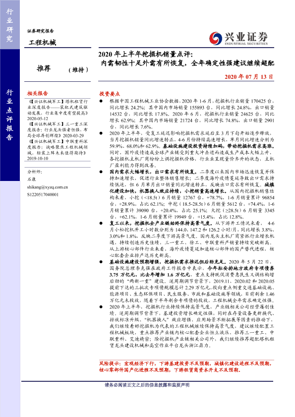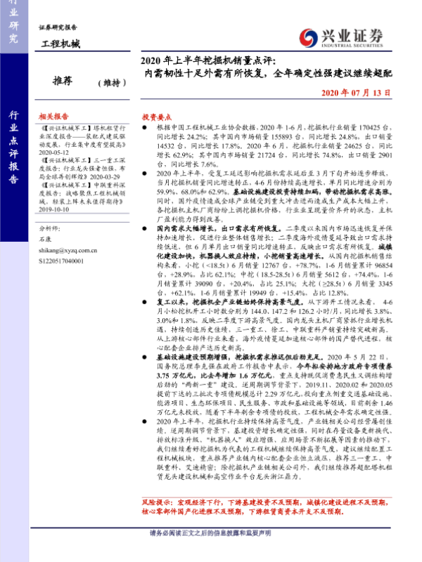 【兴业证券】【20200713】2020年上半年挖掘机销量点评:内需韧性十足外需有所恢复,全年确定性强建议继续超配-6页