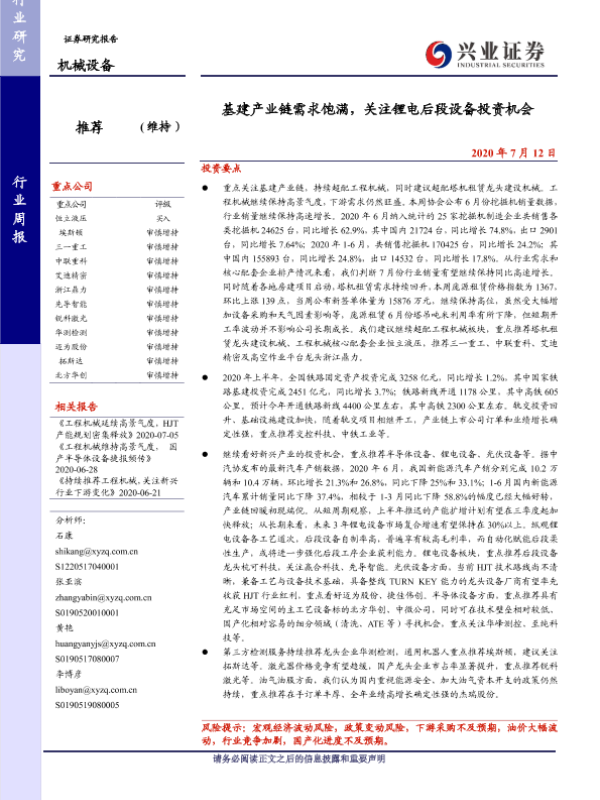 【兴业证券】【20200712】20200712-兴业证券-机械设备行业周报:基建产业链需求饱满,关注锂电后段设备投资机会-19页