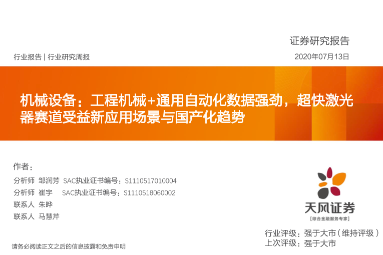 【天风证券】【20200713】机械设备:工程机械+通用自动化数据强劲,超快激光器赛道受益新应用场景与国产化趋势-26页