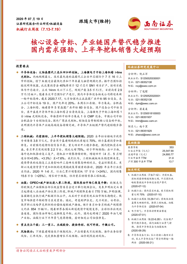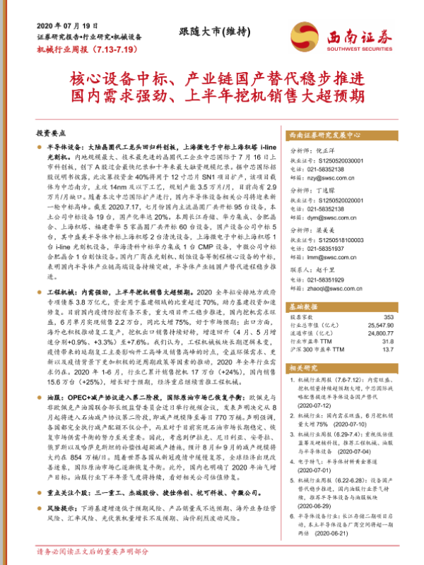 【西南证券】【20200719】机械行业周报:核心设备中标、产业链国产替代稳步推进 国内需求强劲、上半年挖机销售大超预期-20页