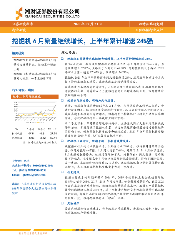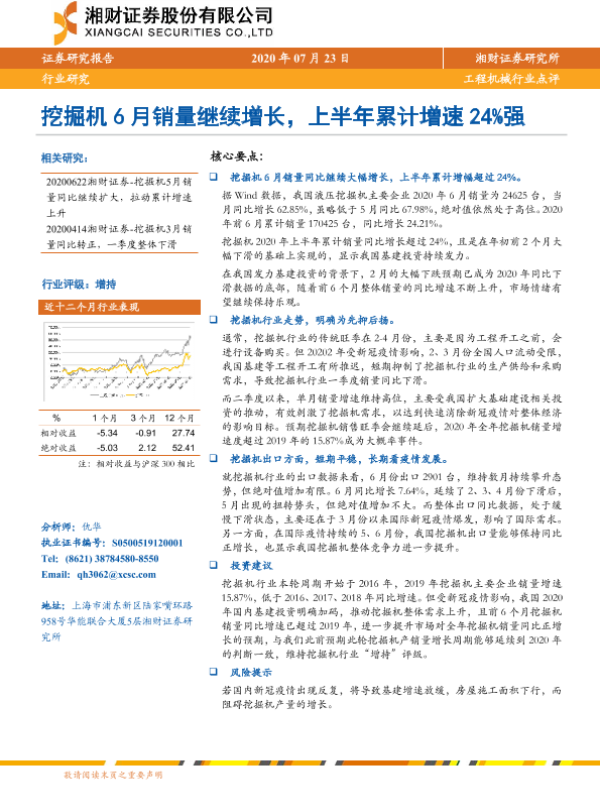 【湘财证券】【20200723】工程机械行业点评:挖掘机6月销量继续增长,上半年累计增速24%强-6页