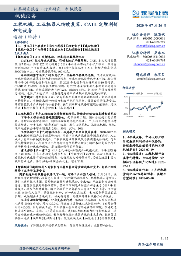 【东吴证券】【20200726】机械设备:工程机械、工业机器人持续复苏,CATL定增利好锂电设备-15页