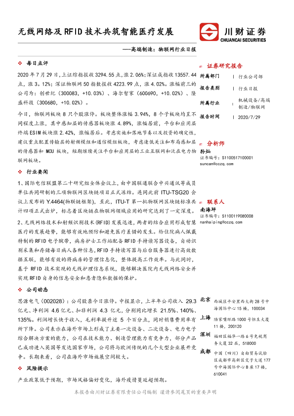【川财证券】【20200729】高端制造:物联网行业日报:无线网络及RFID技术共筑智能医疗发展-2页