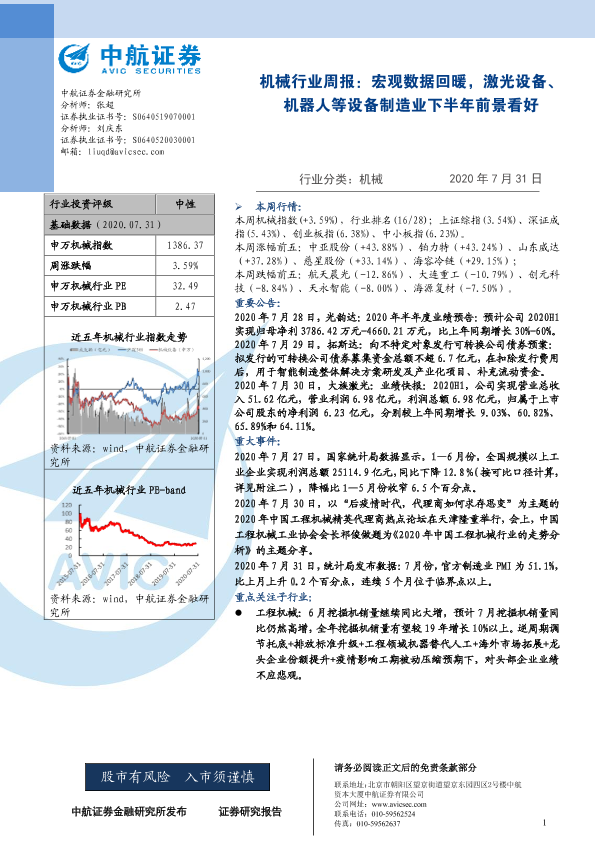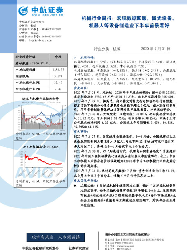 【中航证券】【20200731】机械行业周报:宏观数据回暖,激光设备、机器人等设备制造业下半年前景看好-6页