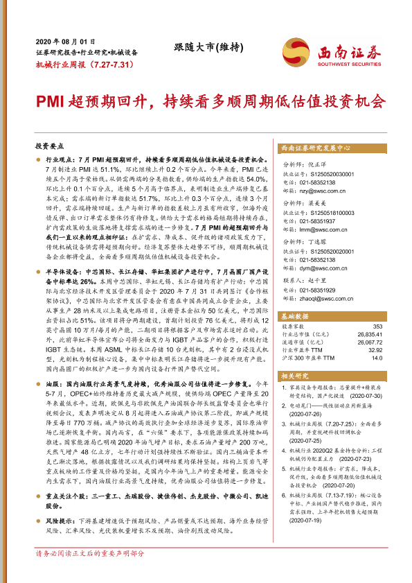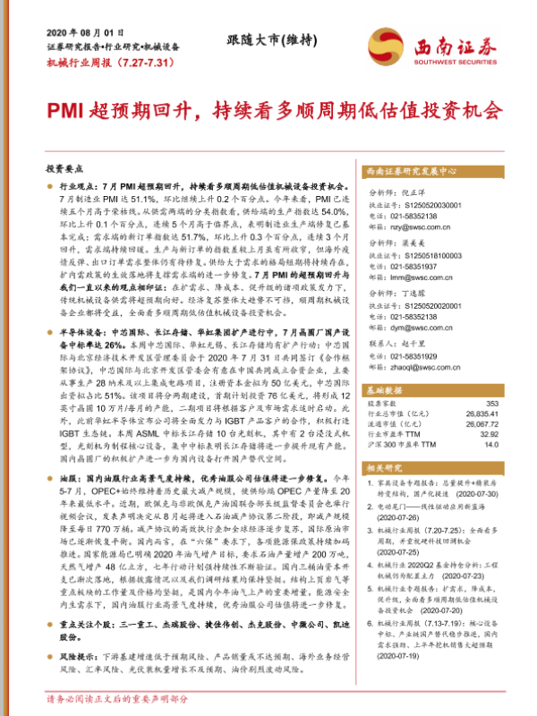 【西南证券】【20200801】20200801-西南证券-机械行业周报:PMI超预期回升,持续看多顺周期低估值投资机会-24页