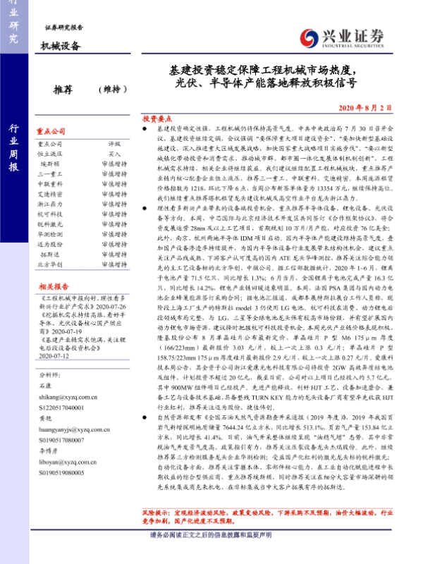 【兴业证券】【20200802】20200802-兴业证券-机械设备行业周报:基建投资稳定保障工程机械市场热度,光伏、半导体产能落地释放积极信号-19页