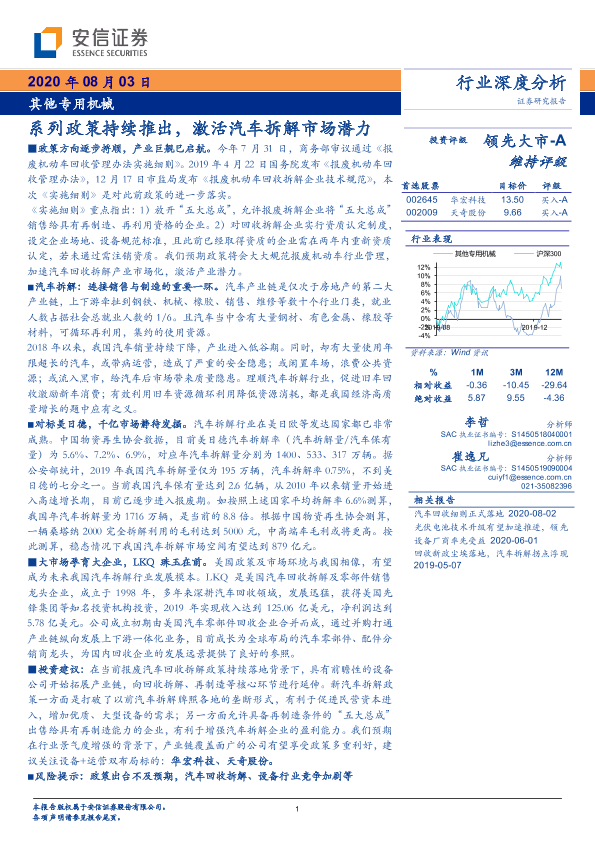 【安信证券】【20200803】其他专用机械行业深度分析:系列政策持续推出,激活汽车拆解市场潜力-31页