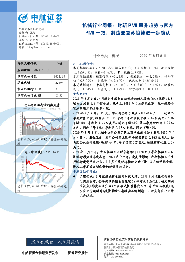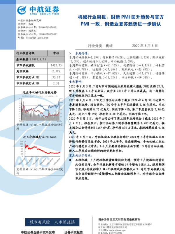 【中航证券】【20200808】机械行业周报:财新PMI回升趋势与官方PMI一致,制造业复苏趋势进一步确认-6页
