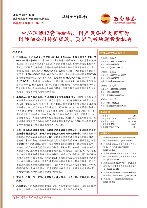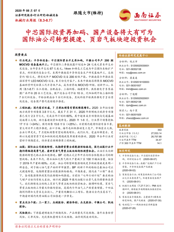 【西南证券】【20200807】20200807-西南证券-机械行业周报:中芯国际投资再加码、国产设备将大有可为 国际油公司转型提速、页岩气板块迎投资机会-23页