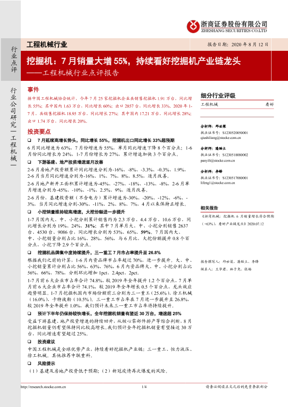 【浙商证券】【20200812】20200812-浙商证券-工程机械行业点评报告:挖掘机:7月销量大增55%,持续看好挖掘机产业链龙头-4页