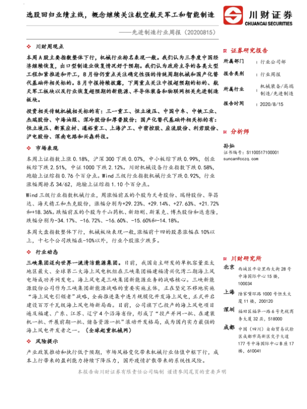 【川财证券】【20200815】20200815-川财证券-先进制造行业周报:选股回归业绩主线,概念继续关注航空航天军工和智能制造-9页