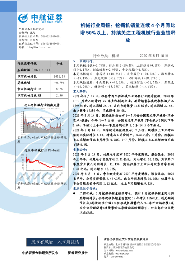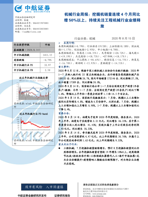 【中航证券】【20200815】20200815-中航证券-机械行业周报:挖掘机销量连续4个月同比增50%以上,持续关注工程机械行业业绩释放-6页