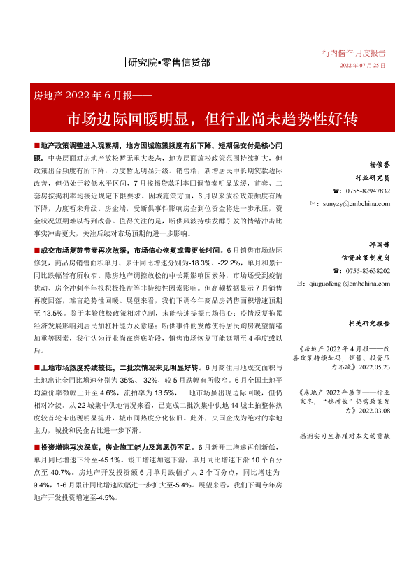 【招商银行】【20220725】房地产行业2022年6月报:市场边际回暖明显,但行业尚未趋势性好转-22页