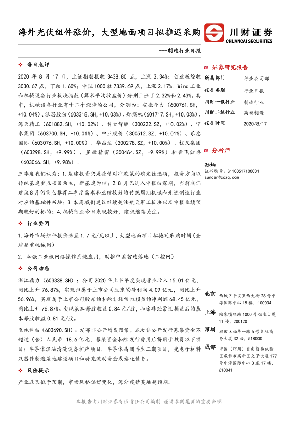 【川财证券】【20200817】制造行业日报:海外光伏组件涨价,大型地面项目拟推迟采购-2页