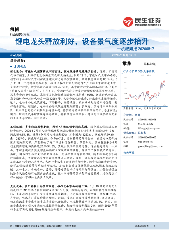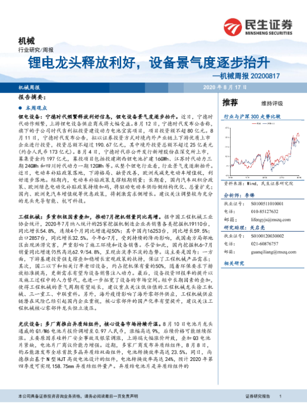 【民生证券】【20200817】机械周报:锂电龙头释放利好,设备景气度逐步抬升-21页