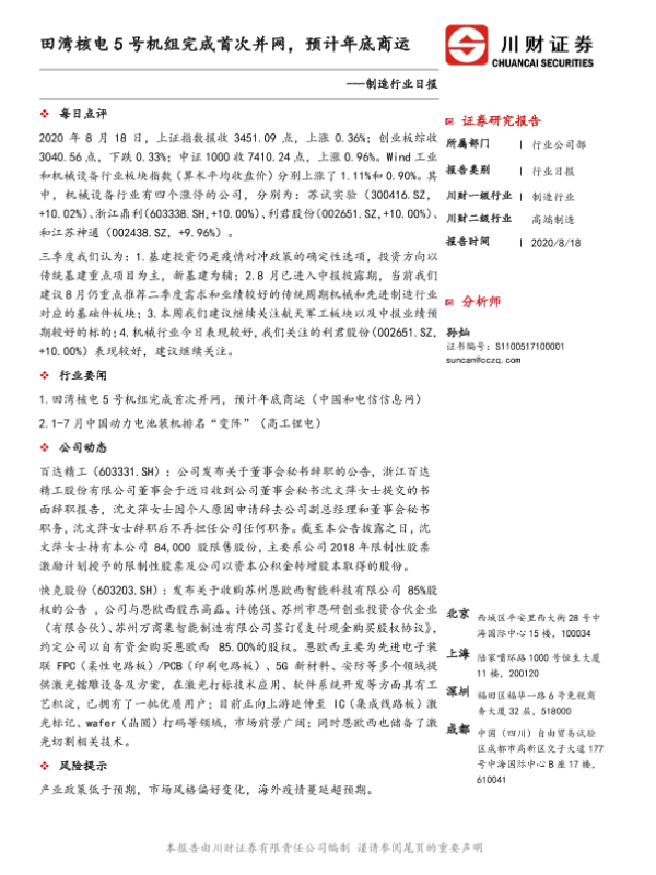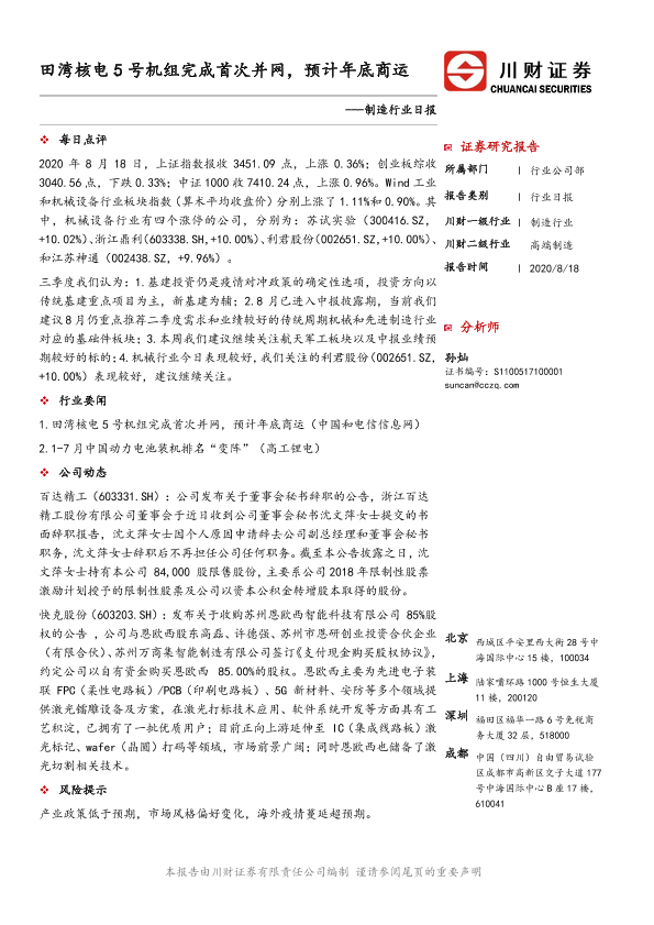 【川财证券】【20200818】制造行业日报:田湾核电5号机组完成首次并网,预计年底商运-2页