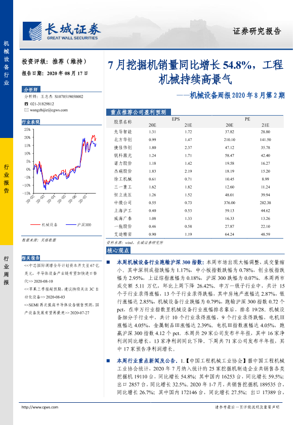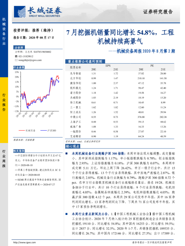 【长城证券】【20200817】机械设备周报2020年8月第2期:7月挖掘机销量同比增长54.8%,工程机械持续高景气-23页
