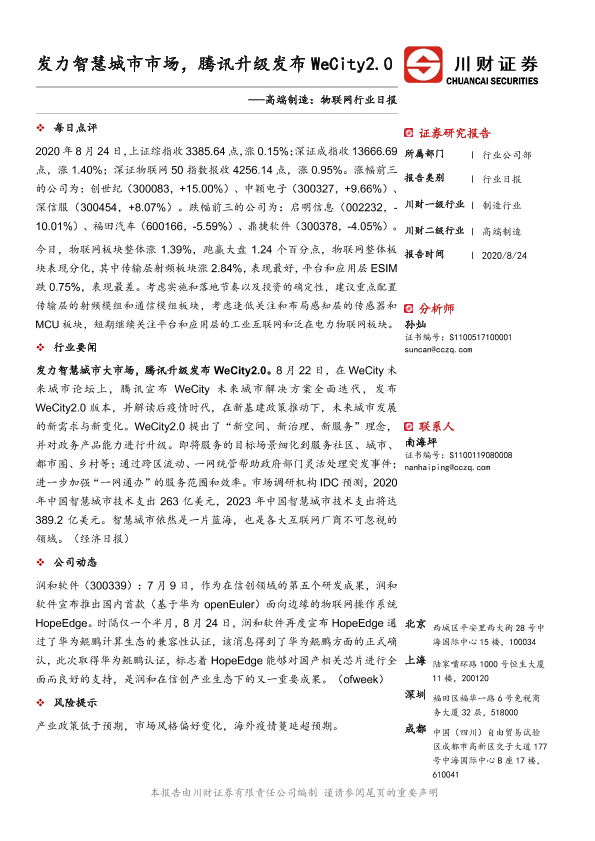 【川财证券】【20200824】高端制造:物联网行业日报:发力智慧城市市场,腾讯升级发布WeCity2.0-2页