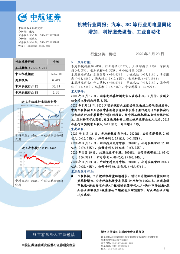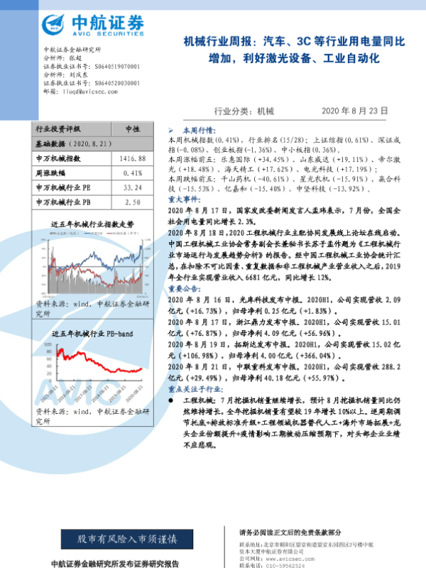【中航证券】【20200823】机械行业周报:汽车、3C等行业用电量同比增加,利好激光设备、工业自动化-7页