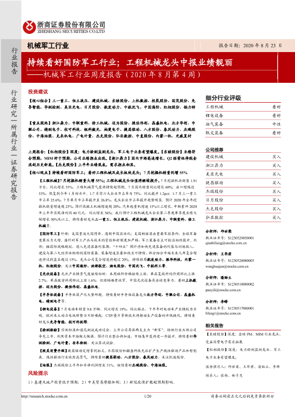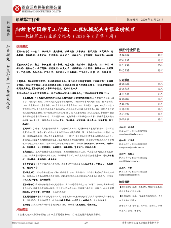【浙商证券】【20200823】机械军工行业周度报告(2020年8月第4周):持续看好国防军工行业;工程机械龙头中报业绩靓丽-20页