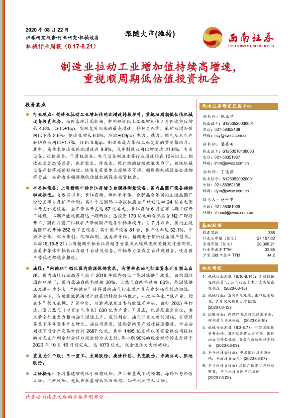 【西南证券】【20200824】20200824-西南证券-机械行业周报:制造业拉动工业增加值持续高增速,重视顺周期低估值投资机会-26页