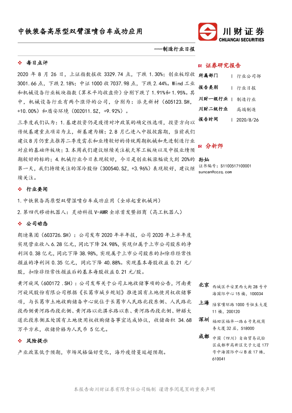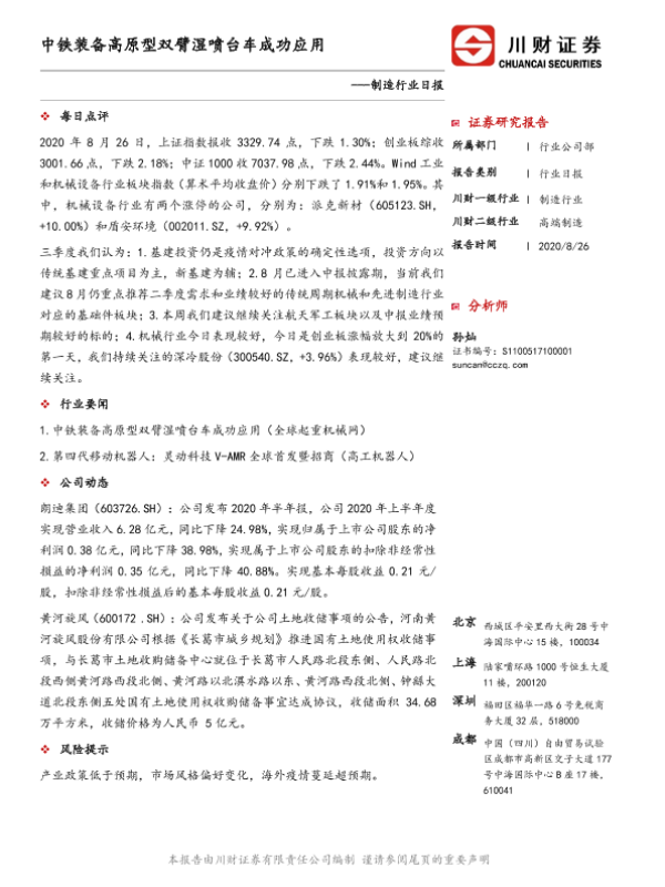 【川财证券】【20200826】制造行业日报:中铁装备高原型双臂湿喷台车成功应用-2页