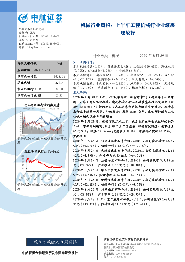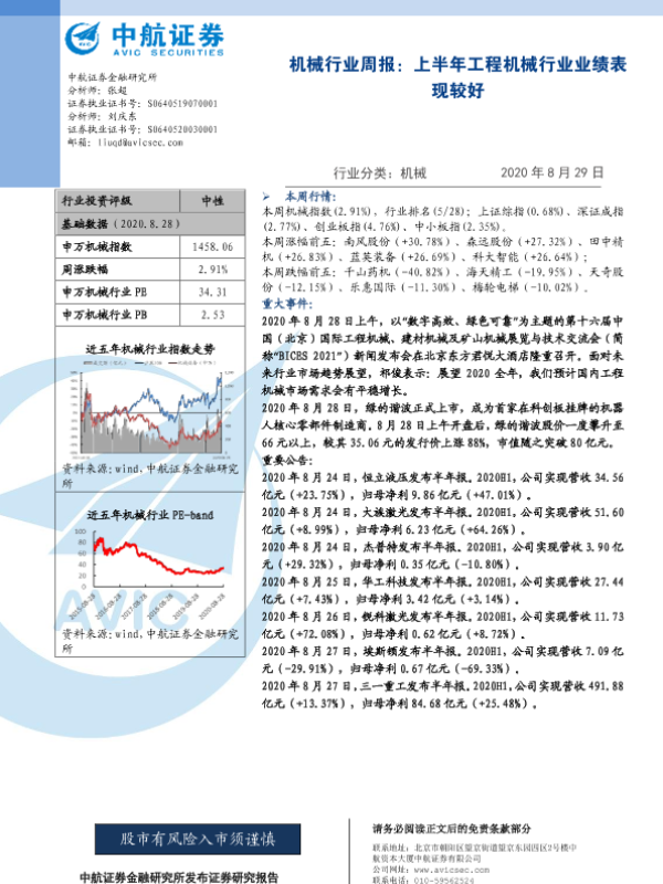 【中航证券】【20200829】机械行业周报:上半年工程机械行业业绩表现较好-6页