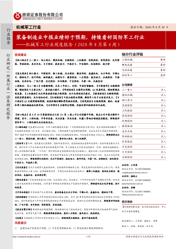 【浙商证券】【20200830】机械军工行业周度报告(2020年8月第4周):装备制造业中报业绩好于预期,持续看好国防军工行业-19页