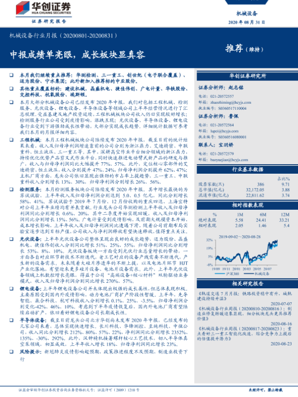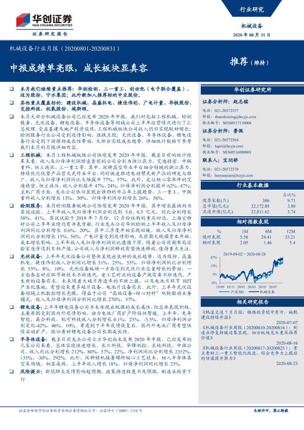 【华创证券】【20200831】20200831-华创证券-机械设备行业月报:中报成绩单亮眼,成长板块显真容-14页