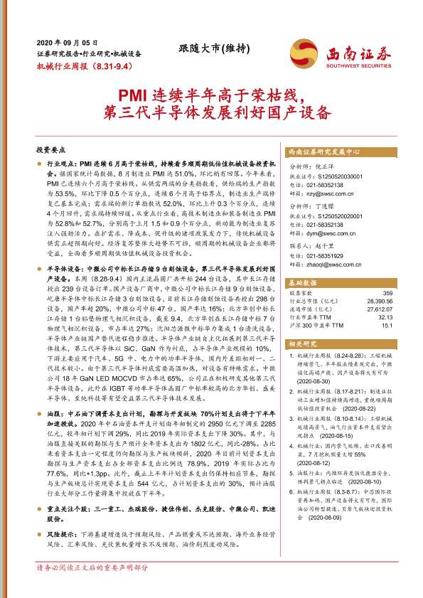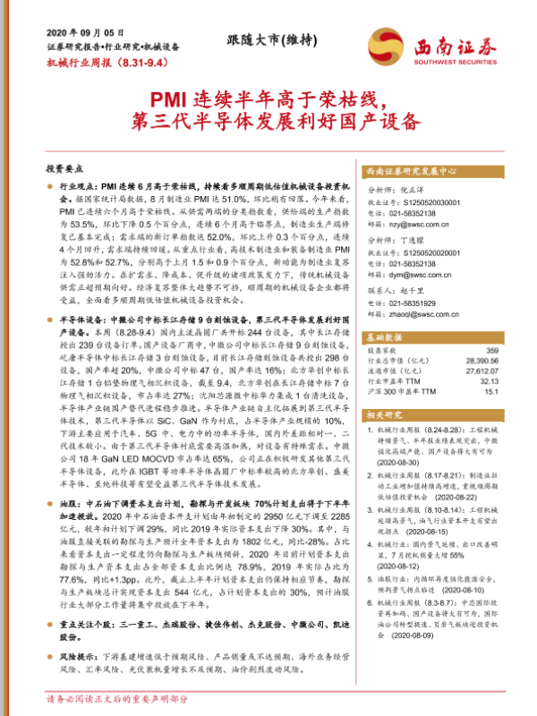 【西南证券】【20200905】20200905-西南证券-机械行业周报:PMI连续半年高于荣枯线,第三代半导体发展利好国产设备-26页