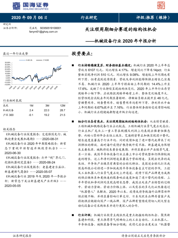 【国海证券】【20200906】机械设备行业2020年中报分析:关注顺周期细分赛道的结构性机会-17页