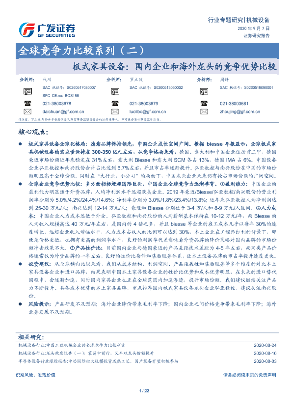 【广发证券】【20200907】20200907-广发证券-机械设备行业专题研究:全球竞争力比较系列(二)-板式家具设备:国内企业和海外龙头的竞争优势比较-22页