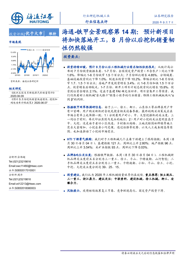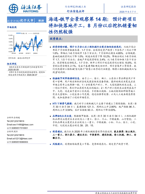 【海通证券】【20200907】海通-铁甲全景观察第14期:预计新项目将加快落地开工,8月份以后挖机销量韧性仍然较强-6页