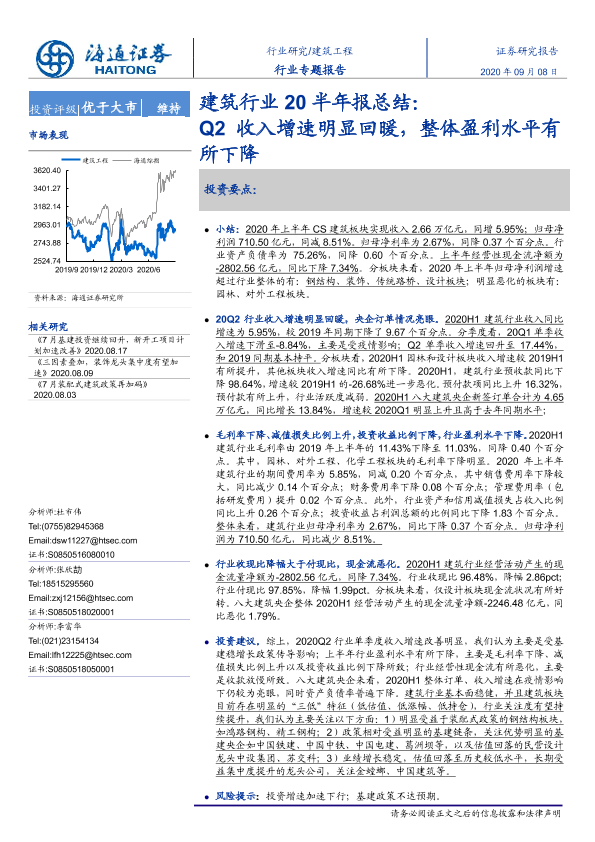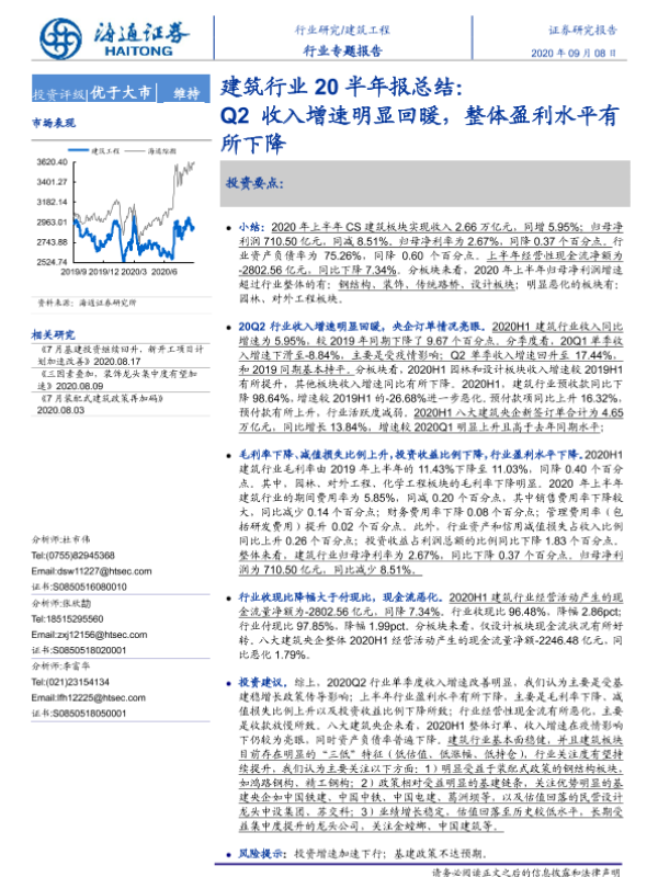 【海通证券】【20200908】建筑行业20半年报总结:Q2收入增速明显回暖,整体盈利水平有所下降-23页