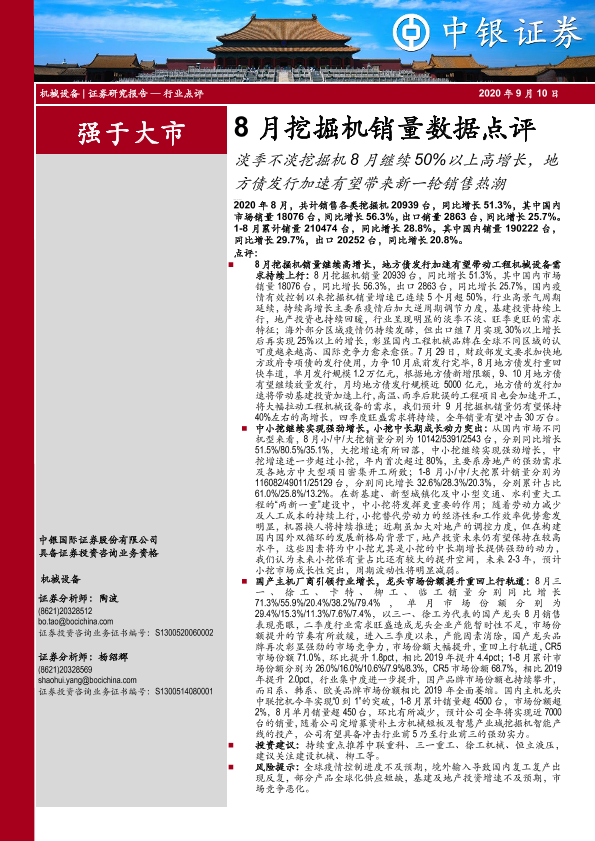 【中银证券】【20200910】8月挖掘机销量数据点评:淡季不淡挖掘机8月继续50%以上高增长,地方债发行加速有望带来新一轮销售热潮-5页