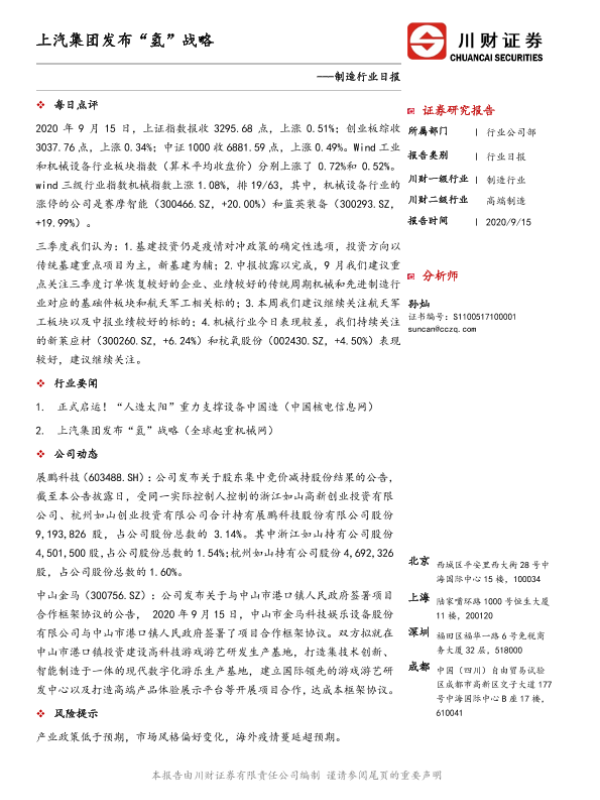 【川财证券】【20200915】制造行业日报:上汽集团发布“氢”战略-2页