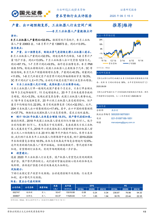 【国元证券】【20200915】8月工业机器人产量数据点评:产量、出口超预期复苏,工业机器人行业空间广阔-3页
