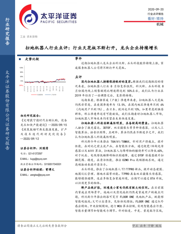 【太平洋证券】【20200920】扫地机器人行业点评:行业天花板不断打开,龙头企业持续增长-5页