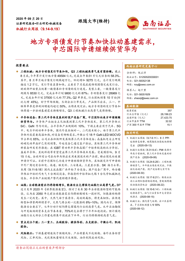 【西南证券】【20200920】机械行业周报:地方专项债发行节奏加快拉动基建需求,中芯国际申请继续供货华为-25页