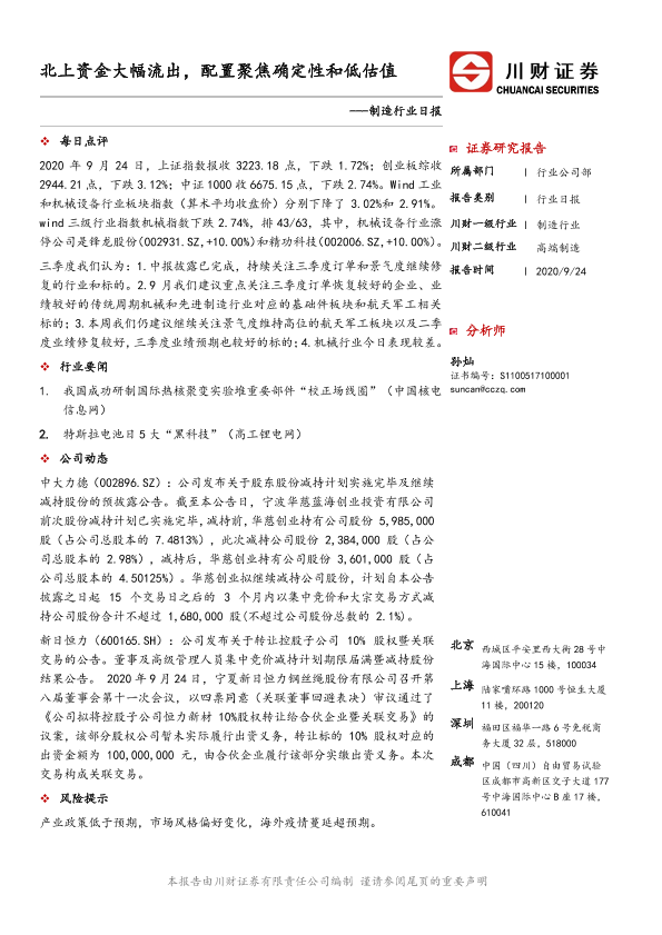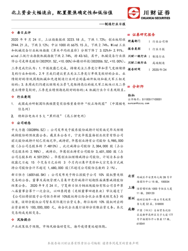 【川财证券】【20200924】制造行业日报:北上资金大幅流出,配置聚焦确定性和低估值-2页