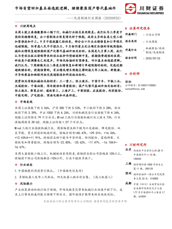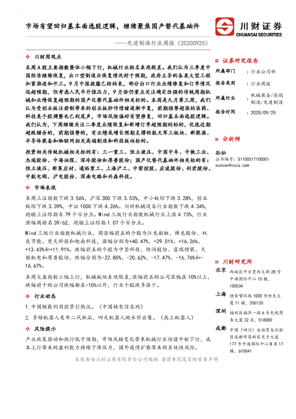 【川财证券】【20200925】20200925-川财证券-先进制造行业周报:市场有望回归基本面选股逻辑,继续聚焦国产替代基础件-11页